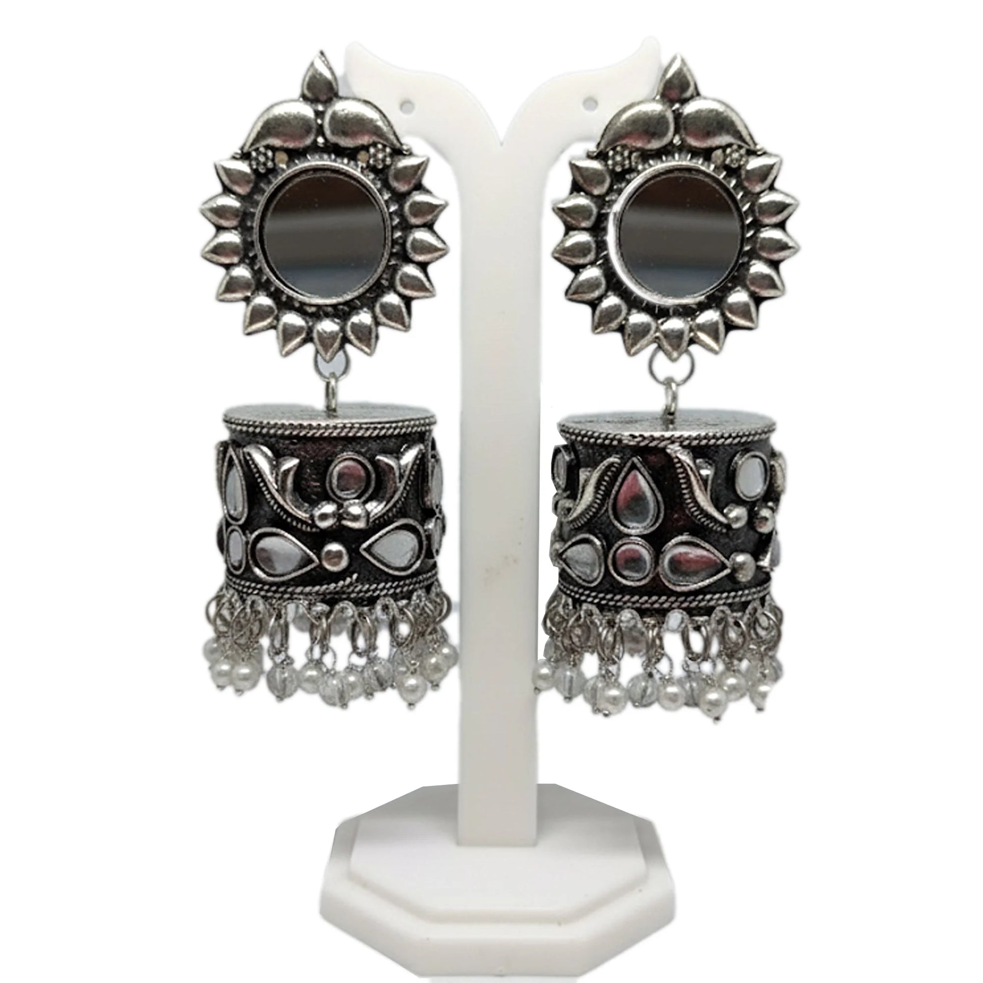 Oxidised Mirror Jhumka Earrings with Beads | Bohemian Ethnic Earrings for Festive Occasions