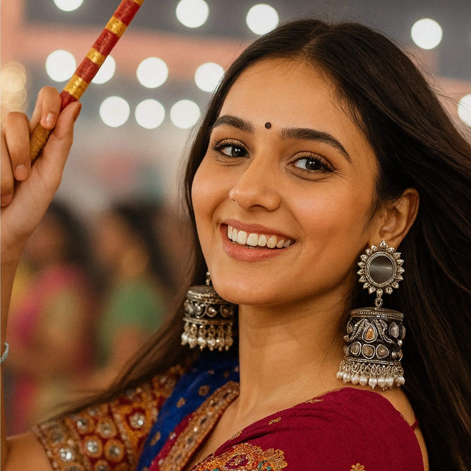 Trendy oxidised jhumka earrings with mirror work on the top and bead drops at the bottom. A stylish choice for festive looks, garba nights, and traditional outfits.